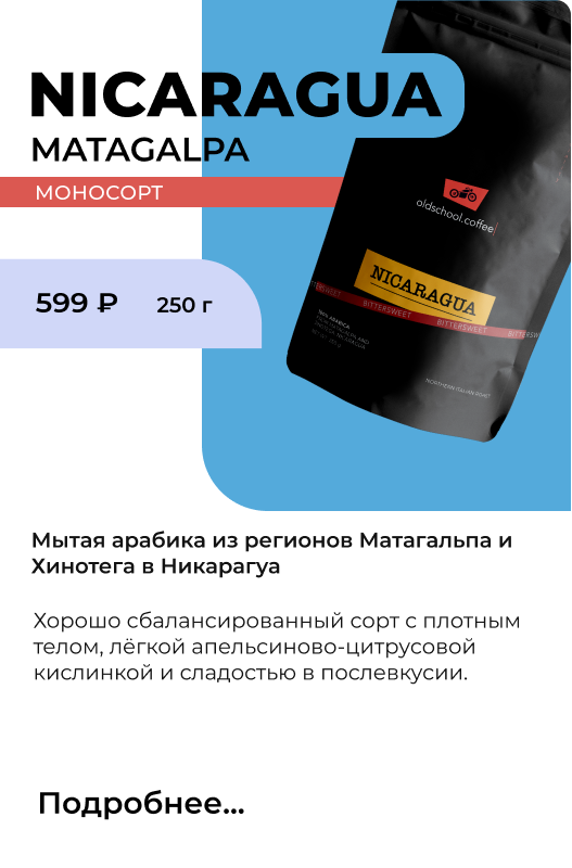 Мытая арабика из регионов Матагальпа и Хинотега в Никарагуа. Хорошо сбалансированный сорт с плотным телом, лёгкой апельсиново-цитрусной кислинкой и сладостью в послевкусии. Североитальянская обжарка.