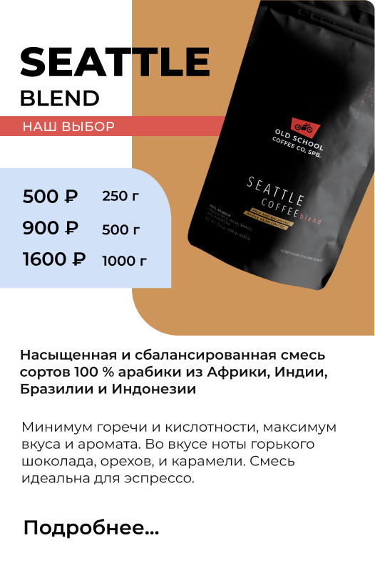 И конечно, весь наш кофе, а в особенности Seattle Blend, идеален в эспрессо. Он составлен из сортов, которые дополняют друг друга в смеси. Одни сорта используются для плотности, другие — для сладости, третьи — для аромата.