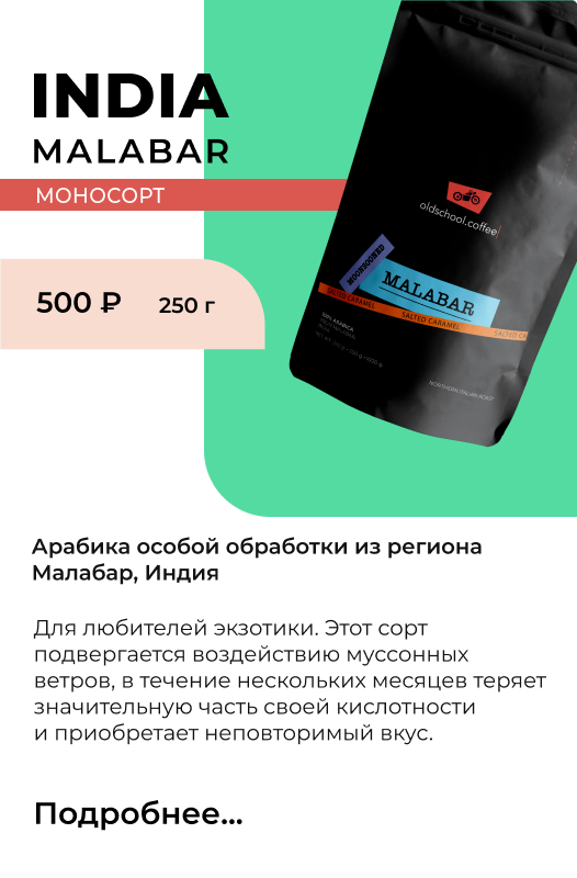 Арабика особой обработки из региона Малабар, Индия. Для любителей экзотики. Этот сорт подвергается воздействию муссонных ветров, в течение нескольких месяцев теряет значительную часть своей кислотности и приобретает неповторимый вкус. Североитальянская обжарка.